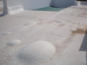 The roof on the right is an example of bubbling from the interior of the foam material, also known as blistering. Blistering happens when there is moisture trapped between the underlayment and the foaming material.